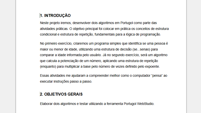 Neste projeto iremos, desenvolver dois algoritmos em Portugol como parte das atividades práticas. O objetivo principal foi colocar em prática os conceitos de estrutura condicional e estrutura de repetição, fundamentais para a lógica de programação.